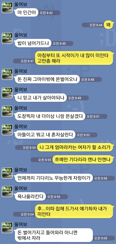 ㄱ ㅐ미친년이지; ㅋㅋㅋㅋㅋ 지는 ㅅㅂ 조카 무능해가지고 돈이 궁해가 넘어가는 상황인데 돈 10원도 못 보탠년이;; 엇다대고 개 지랄이고 돌은년이네 나가디져라카고 헤어지라 도란나 저런거랑 살게