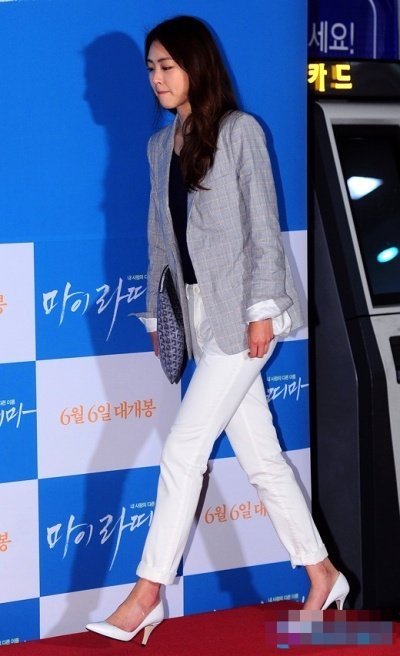하얀 슬랙스에 페일블루 블레이저를 걸치고 시사회에 온 이연희