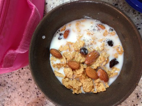 다이어트 시리얼+ 건포도+아몬드 몇알+ 땅콩 몇알+ 무지방 우유입니다! 나름 배부르고 맛있어요 ㅎㅎ