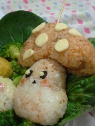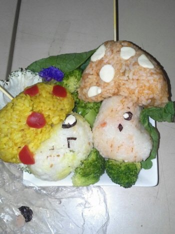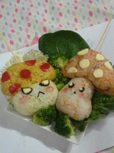 방법 : 버섯대가리는 참치김치, 카레밥, 몸뚱이는 흰밥으로 만든 주먹밥에 속을 넣음.