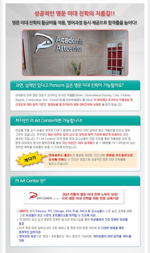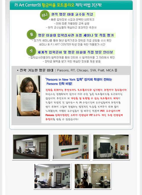 P.I Art Center는 미국 명문 미대를 가기 위해 공부하는 학생들과 함께 꿈을 키워온 지 1986년 개원(미국 주정부 정식인가 1991년) 이래 벌써 25년이 되었습니다.