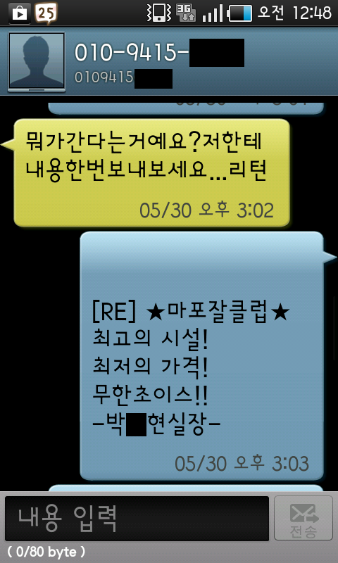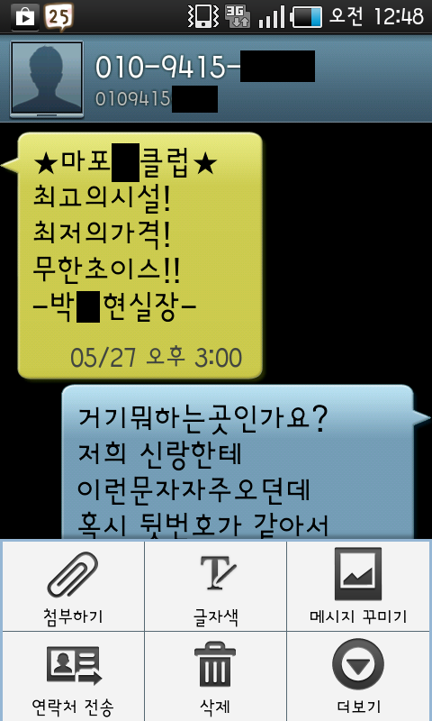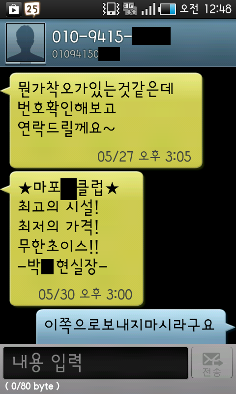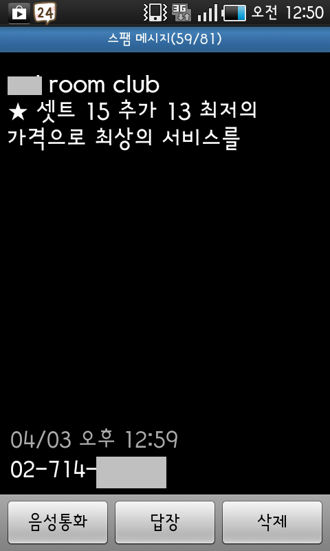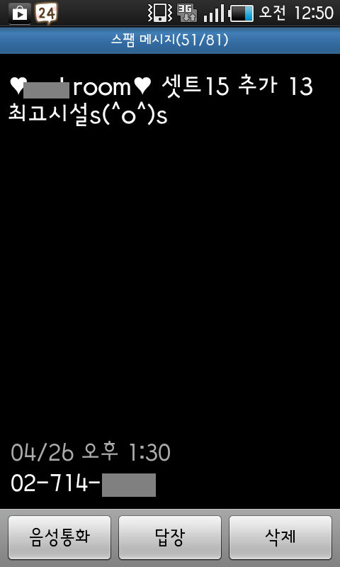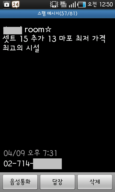 몇달전에 술집번호로 룸싸롱 홍보하는 문자가 왔어요 으레 하듯이 스팸등록했구요