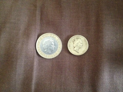 왼쪽에 보이는게 2파운드짜리 오른쪽에 보이는게 1파운드 짜리 동전이에요. 2파운드짜리가 더 크기가 크신게 눈에 들어오시죠? 디자인이 조금 다르기도 하구요.
