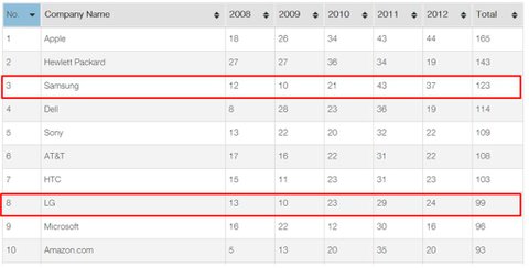 표3: NPE 피소 상위 10대 업체 및 소송건수 (2012년 기준)