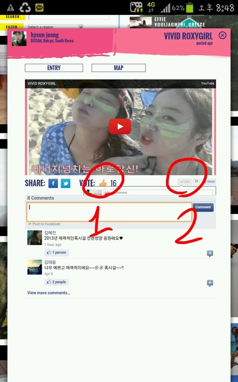48명의 해외참가자들과 겨루고 있는데 외국참가자들은 어떻게 투표하는지 1000명이 넘구있는데 제가 인맥으로만 투표하니 한국인투표율이 너무 저조해서ㅜ 실례를 무릅쓰고 이렇게 글을씁니다^^! 방법은 간단하구요 ★ https://roxydare.quiksilver.com/facebook/fbtabpage/gallery/19027/en★이링크에 접속하셔서 North asia -south korea "hyeun jeong jun " 전현정 vote : 손가락(좋아요)모양 꾹 눌러주시면돼용^^ 6월 12일까지 하루한번 투표가능하구요
