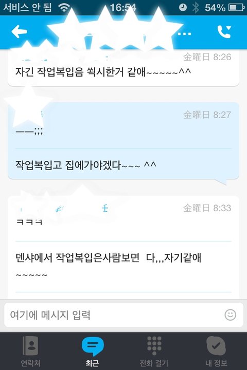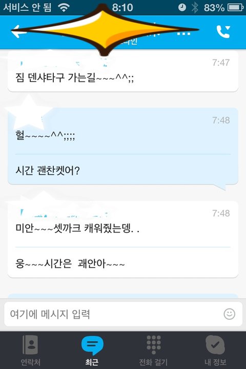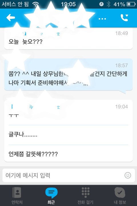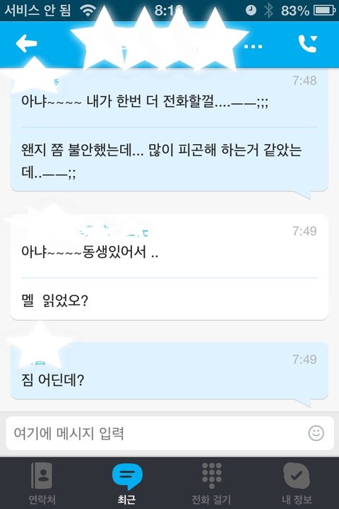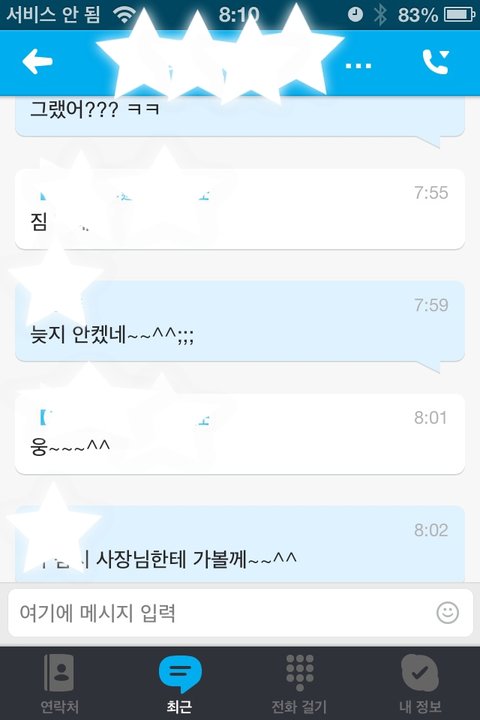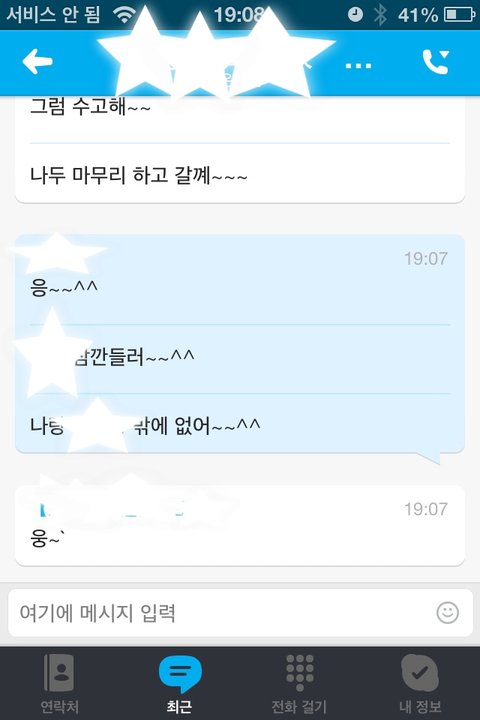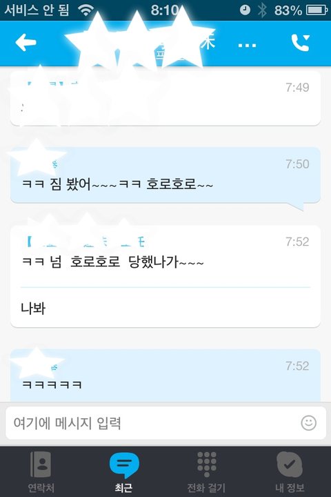 그래서 혹시나 해서 제 핸폰(인터넷만쓰는 단말기)로 스카이프 깔고 남편 아이디랑 비번 넣고 접속 했더니 저렇게 실시간으로 뜨더라구요...