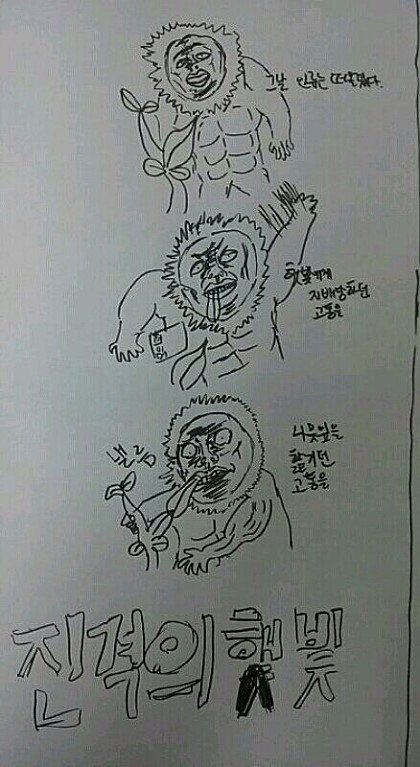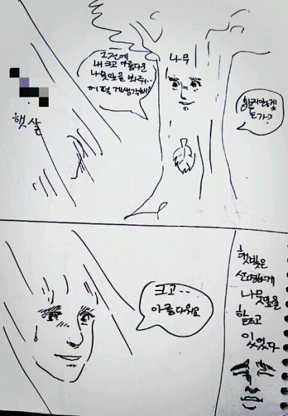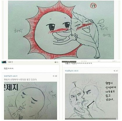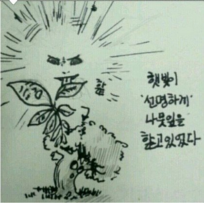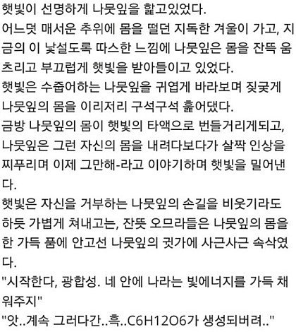 햇빛이 선명하게 나뭇잎을 핥고 있었다. "그... 그만해..." 나뭇잎이 나지막하게 소리쳤다. "가만히 있어봐 밤에는 느낄 수 없는 것을 느끼게 해주지" 햇빛이 말했다. "이.. 이제... 진짜 그만해... 더... 더 이상 했다가 나..." 나뭇잎은 못 견디겠다는 어투로 부탁했다. "후후 뭐가 그만해야? 벌써 너의 엽록체는 이렇게나 반응하고 있는데 말이야" 햇빛은 부탁하는 나뭇잎을 비웃으며 더욱 강도를 높여갔다. "이제 진짜... 진짜 그만해 나 이러다가 초록빛으로!!!" "..." 나뭇잎는 한계라는듯이 애원했지만 햇빛은 묵묵히 강도를 높여갈뿐이였다. "아.. 아 이제 더는 안되!! 나...나 이제!!" 나뭇잎은 한계였다. 그때 햇빛은 정오의 위치 가장 많은 일조량을 뿜으며 말해다. "하하하 일조량 최고치다! 더 이상은 못버티겠지?? 이대로 배부르게 해주지 나의 빛원자 하나하나를 다 받아드려라!!" 하지만 이미 나뭇잎에게는 그 외침조차 들을 여유가 없었다. "하아... 이제 더는 안 돼 아 광합성... 광합성으로 가버렸!!!" 나뭇잎은 결국 버티지 못하고 햇빛의 모든것을 받아드려 버렸다. 그때였다. 거짓말처럼 맑던 하늘은 어두워지고 소나기가 내리기 시작하였다. 빗물이 달려왔다. "나뭇잎! 나뭇잎 괜찮아?" 하지만 빗물은 한 발 늦었다. 이미 나뭇잎은 햇빛의 모든것을 받아드리고 이성을 잃은 상태였다. "하.아 하아 햇빛님 하아 너무 좋아요 저에게 빛을 더 뿌려ㅈ...." 나뭇잎은 촉촉하게 젖은 채 혼잣말을 반복할 뿐이었다. -------------------------- [출처] 햇빛이 선명하게 나뭇잎을 핥고 있었다 (리그 오브 레전드 한국커뮤니티) |작성자 딸기머핀