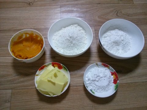 단호박 삶아 으깬 것 100g, 박력분 100g, 전분 60g, 버터 80g, 슈가파우더 30g(또는 설탕15g)