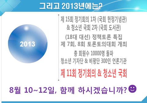 방학때만 잠깐 하는 행사가 아니라, 2003년도부터 지금까지 10년 넘도록 "정기회의", "임시회의"는 매년 개최되는 청소년의회의 공식행사입니다.