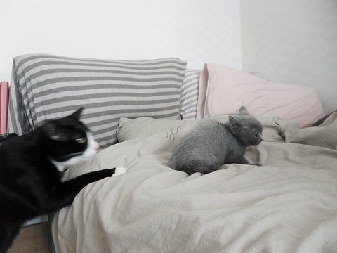 지는 신경쓰여 죽겠는데 침대에서 딩굴딩굴 잠만 잘 자는천이가 얄미웠는지