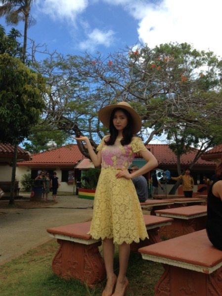 자칫 촌스러울 수 있는 노랑이 레이스 원피스도