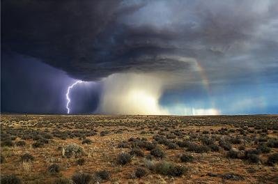 눈부시게 빛나는 무지개, 먹구름을 가르는 번개, 지평선을 휩쓰는 회오리바람