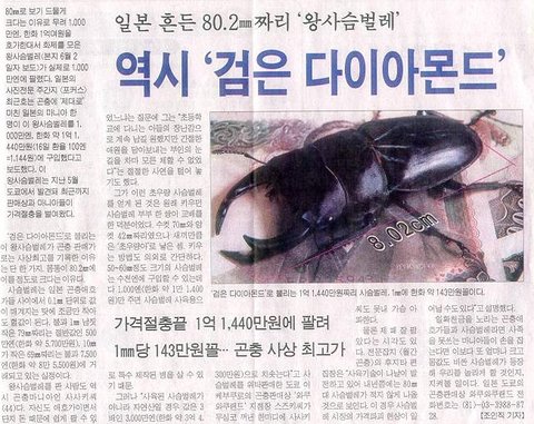 잘 보이실지 모르겠지만 1999년 일본에서 80의 왕사슴벌레가 약 1억에 낙찰됬다는 기사입니다.