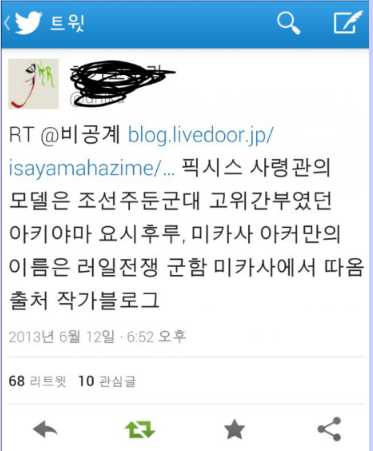 근데작가가 옹호한 군인은 우리나라에 있어서는 부정적인물임 하지만 그 개인 생활은 매우 청렴한사람이었다고함 마치 나치의 롬멜장군같은사람임 그리고 조선침략후 교련이라고 알꺼임 학생들한테 무기들고 싸우게하는거 가르치는건데 군이 교육에 터치하면 안된다고 했다함 그리고 미카사빼고도 미국전함이름쓴 등장인물도있음내생각엔 그냥 군에 관심있고 군인정신과 그 개인의 인간됨됨이를 좋아했던것같음--------------------------------------------- ㅋㅋㅋㅋ 다들 말도 안되는 비유를 하면서 달려드시네요 http://pann.nate.com/talk/318529750 자 이글 읽고 와요 참고로 제가 제일 싫어 하는 사람은 아가리로 애국하고 일본 까는 것이 마치 자신이 윤봉길의사나 유관순열사가 된듯이 착각하는 부류입니다. 솔직히 진격의 거인 안읽는다고 무슨 큰 일이 있겠습니까??ㅋㅋㅋ 다만 정말 저쪽이 싫고 까고 싶다면 제대로 사건 전말을 알고 까야지 알지도 않고 날뛰는 사람들이네요. ㅎㅎㅎ 전 참고로 지금까지 어떠한 연예인 루머이든 뭐든 함부로 악플 한번 안달아 본 사람으로서 정말 어이 없네요 참고로 드래그질 하면 손가락 부러지는 분들을 위해 짧게 설명하면 오히려 제가 언급한 사람은 친한파였다는 겁니다. 여기는 참 확실히 이상한곳같네요 멀쩡한 사람 친일파만들고 그리고 저 일본 침략에 대해서 이렇게 생각합니다. 물론 쳐들어온 일본 군국주의 세력들 죽여도 시원치 않아요 그런데 침략당한 가장 큰 이유는 약했기 때문이에요 아닌 말로 우리나라가 강했다면 문물을 빨리 받아들이고 세계정세에 빠른 대처를 했다면 우리나라의 열사분들 피 안흘리고 정말 행복한 삶 살으셨을 겁니다. 만약 일본이 침략안했어도 영국놈이나 러시아 미국 사람들이 이 더러운 조선 쿨리놈들 하고 학대 했겠지요. 일본보다는 덜했을지도 모르지만 님들이 지금 해야하는 건 훌륭한 작품이든 뭐든 좋은걸 받아드리고 배우고 실력을 쌓아서 일본을 뛰어넘어 다시는 이런 역사를 반복해야하지 않아야하는거 아닌가요? 단순히 일본을 보면 거품물고 달려들것이 아니라? 만약 이런 모습 보면 얼마나 세계인들이 비웃을까요? 과거의 아픔 때문에 마치 트라우마 생긴 사람 처럼 일본만 보면 물고 늘어진다고 평범한 사람까지 우익으로 만드는 것 밖에 못한다고 과거에 묶여 진격하지 못하는 나라라는 이미지가 보이겠지요. 물론 위안부 문제나 우리가 처리해야 할 문제에 대해서는 논리적으로 처리하고 한치의 양보가 있어선 안되지만 감정적으로 대처하는 것 역시 잘못된 것 입니다.