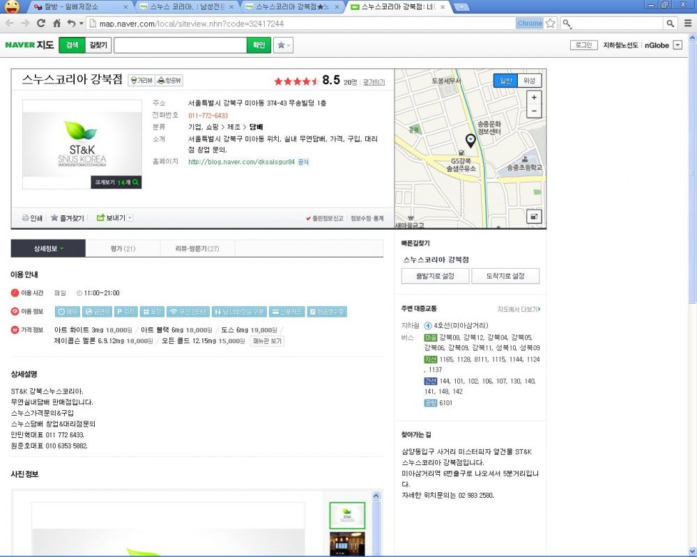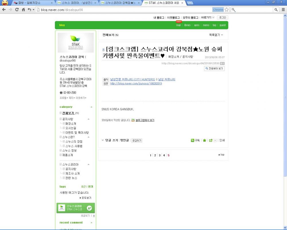 스누스 코리아 강북점 네이버 맵과 공식 블로그 링크