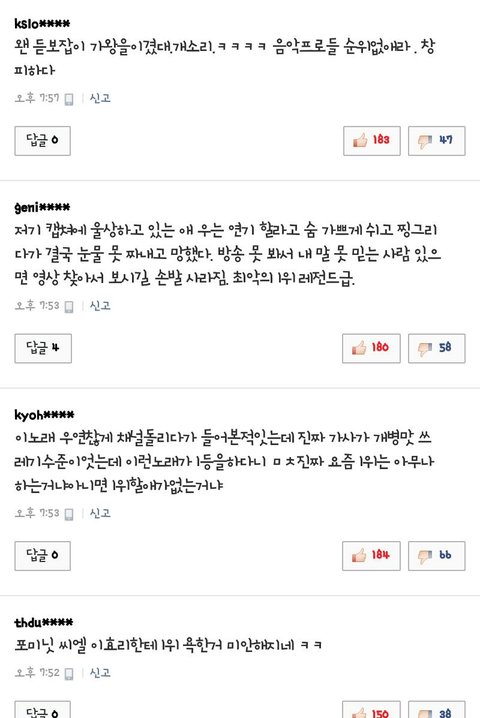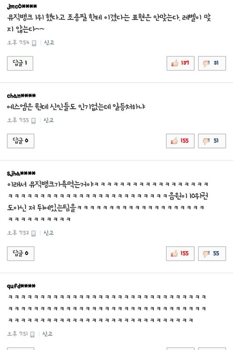 힘들게 1위했다고? 다른가수들 새로운곡몇개씩 익힐때너네는 1년동안 저 거지같은노래 만연습했잖냐?ㅋㅋㅋㅋㅋ다른가수들이 너네보다 더했으면더했지너네처럼 날로 먹는가수도 없을거다 듣자자니 중국리더는 반년넘게 해외에서 휴가보냈다고하고 백현인가하는놈은 연생기간없이 바로데뷔했다던데 너네가정말열심히했다는소리를할수있는가수냐? 연습안하고 지구종말기념으로 여자끼고 술이나마시는놈들이다ㅋㅋㅋㅋ