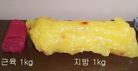 근육과 지방의 크기 차이가 느껴지는가? 체중은 적게 나가지만, 지방이 많으면 당신은 뚱뚱해 보일 수밖에 없고 체중이 많아도 근육량이 많으면 당신은 아름다운 라인을 가지고 있을 것이다.