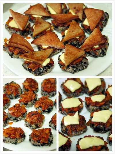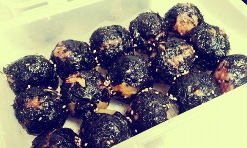 주먹밥에 볶은김치를 올려주고 치즈 올린 뒤 스팸을 얹어 줌!!!