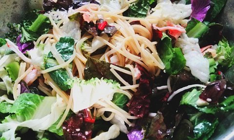 쌈채소에 파스타면을 푹 삶아서 찬물에 헹구고 넣어줌..
