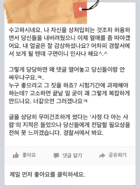 본인 페이스북에 리플단 사람들 명예훼손으로 고소하겠다고 새벽다섯시에 경찰서 다녀왔다고 자랑질함.