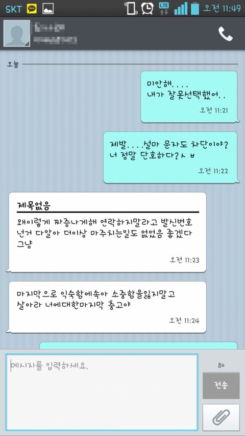 나란 놈 잘해주진 못했지만 잊고 행복하게 지내라..놓아줄께..