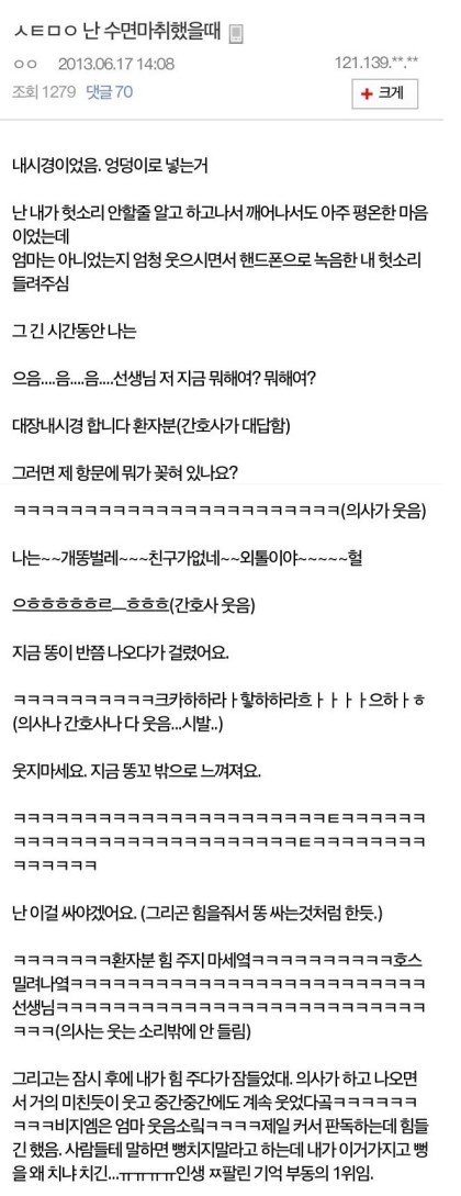 것도 있는데 어떤 여성분이 항문내시경 받을라고 수면마취하고 이제 항문으로 내시경 넣는데 여자 왈. 오빠 거기 아냐 ㅋㅋㅋㅋㅋㅋㅋㅋㅋ의사 빵 터짐