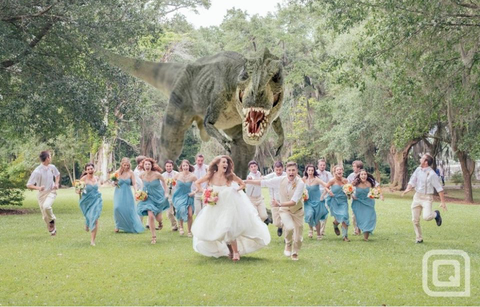 사진기사가 신부와 친구들에게 공룡에게 쫓기는 연기를 해보라함