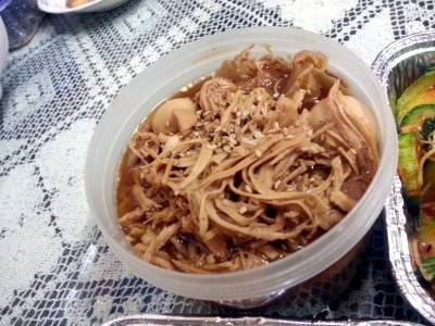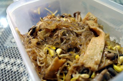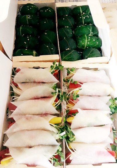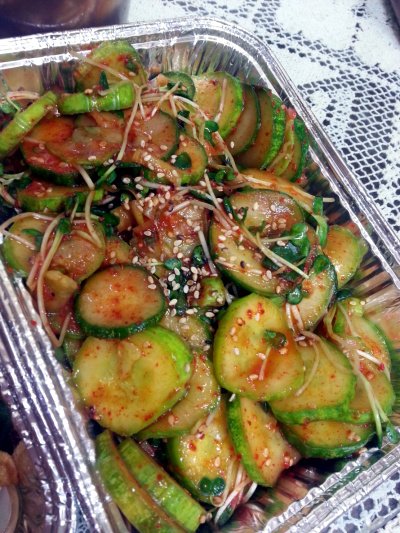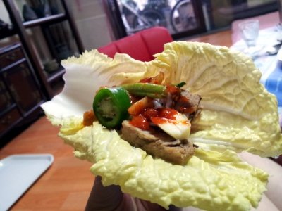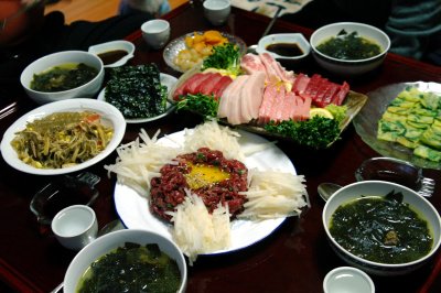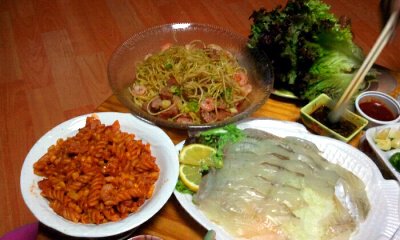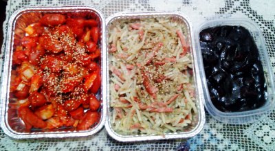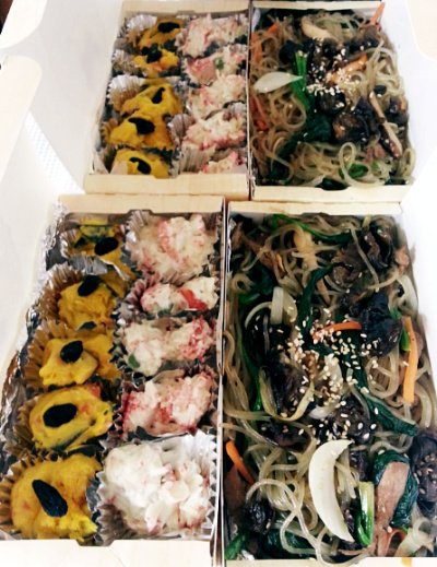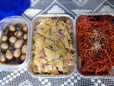 우엉근대쌈밥, 잡채, 훈제오리무쌈말이, 그리고 쿱항에서 산 샐러드......