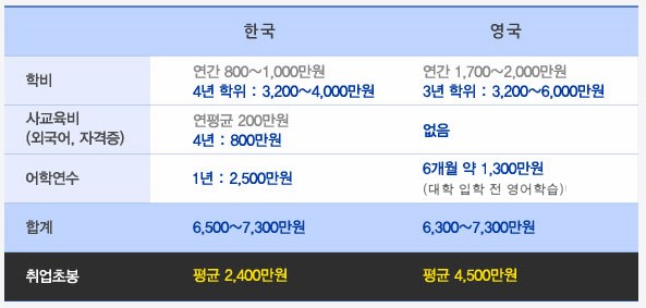 영국은 한국과 달리 3년이면 학사학위 취득이 가능합니다. 학비는 비슷한 수준의 미국사립학교에 비해 저렴한 편이며, 유학생들에게도아르바이트를 할 수 있는 기회가 제공되고 있습니다.