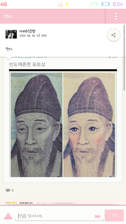 근데웃긴게 조상얼굴그려진 지폐 접고 신기한표정나온다고 좋아할때는언제고 포토샵한번햇다고 카스공유가저렇게욕먹나? 이해안가네