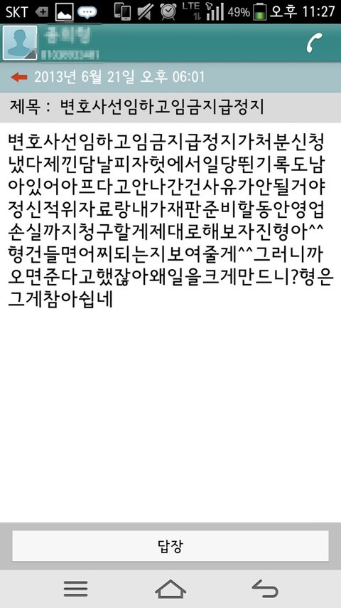 나한테 찾아와서 용서도 안비냐?월급 여기 와서 꼭 가져가라 이렇게 얘기하는겁니다.아니 자기가