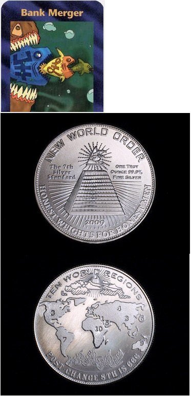 또한, 세계 단일 화폐를 추진할 것 같습니다. Bank Merger(은행 합병)이라는 일루미나티 카드를 보세요.