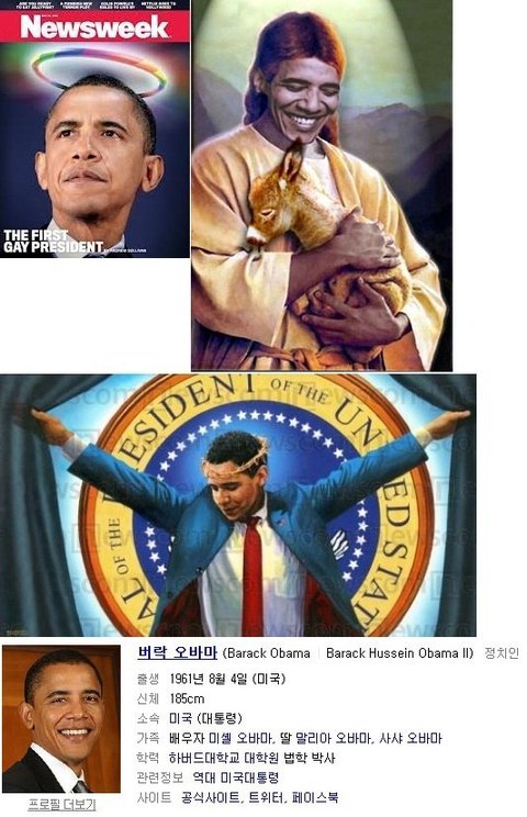 ※ 개인적인 견해로 성경 요한계시록을 보면, 용의 권세를 받은 바다에서 올라온 일곱 머리와 열 뿔을 가진 짐승이 언급되며, 이 짐승의 일곱 머리 중 하나가 큰 상처를 입은 듯했으나 회복되어 사람들이 이를 신기하게 여겨 따르게 된다는 구절이 있는데, 이 역할을 오바마 대통령이 할 듯합니다. 폭스 뉴스의 다분히 고의적으로 보이는 오바마 사망 오보, 오바마를 재림 예수화한 달력 출시, 오바마를 죽어서 영혼이 된 사람처럼 묘사한 뉴스위크의 표지 등등을 미루어보아, 훗날에 오바마가 암살되어 완전히 죽은 듯하다가 기적적으로 살아나는 일을 보여줄 것임을 암시하는 듯합니다.