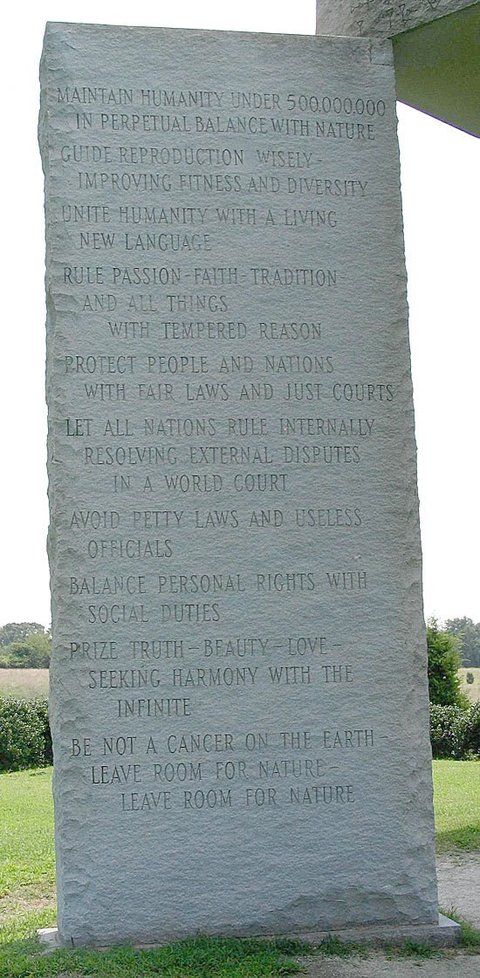 미국의 스톤헨지라 불리는 조지아 가이드 스톤이라는 것이 있는데, 미국 조지아주 북부 지역의 불모의 땅에 세워진 이 거대한 비석은 높이 6.1m에 총 무게 110톤이 나가는 상당히 큰 구조물이며, 기하학적 대칭 형태를 이루며 서 있는 4개의 돌비석의 8면에는 각기 다른 8개 언어로 십계가 새겨져 있습니다. 영어, 중국어, 러시아어, 스와힐리어, 히브리어, 아랍어, 힌두어, 스페인어로 현대 인류가 가장 많이 사용하거나 역사적, 언어학적으로 비중이 컸던 언어들 중 대표적인 8개 언어로 새겨진 것입니다. 이 비석의 내용에는 일루미나티의 어젠더가 그대로 드러나 있습니다.