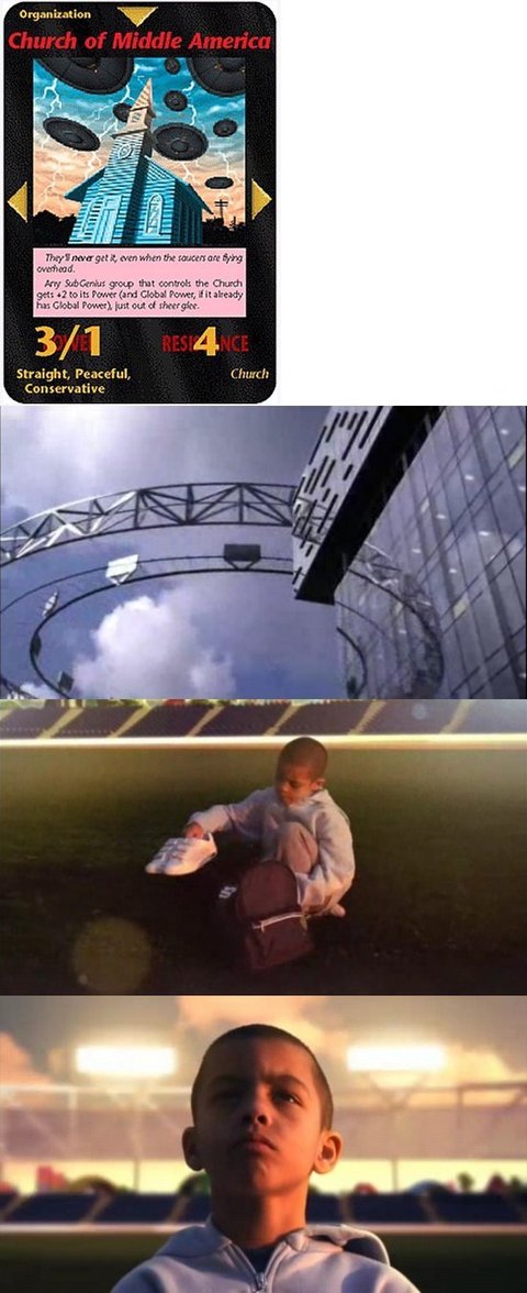 그리고 여기 Church of Middle America(미국 중소도시의 교회, 중앙 아메리카의 교회)라는 일루미나티 카드를 보세요. 교회에 UFO들이 출현한 모습입니다. 교회에 무슨 흥미로운 일이 있어서 UFO가 찾아올까요? 어쩌면 이것은 교회의 휴거가 초고도의 과학기술에 의해 정말로 실현될 것임을 암시하고 있는 것일지도 모르겠습니다.