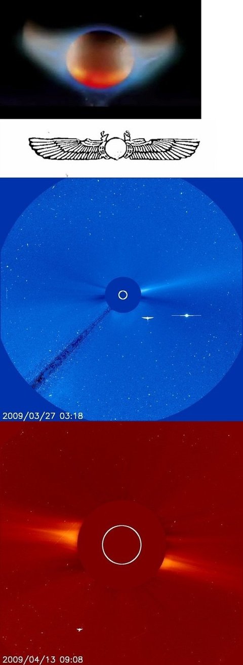 또한. 호피족, 수메르 문명, 홍산 문명의 전설에서 말하기를, 말세가 되면 '날개달린 신들의 별'이 나타날 거라고 했는데 스샷을 보시다시피 니비루는 날개 달린 별처럼 보입니다. 스샷이 조작인지는 모르겠지만 니비루가 날개달린 별의 모습으로 묘사 혹은 보인다는 점은 거의 대부분의 전설 및 사진들의 공통점입니다. 서너번째 스샷은 '소호(SOHO)'라는 인공위성이 니비루로 추정되는 날개달린 천사 형상의 별을 촬영한 것입니다.