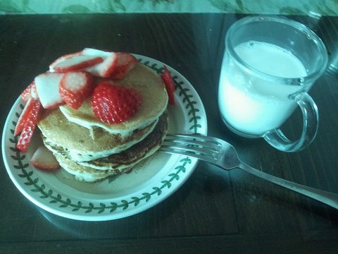 다음날 아침에 핫케이크 만들어서 딸기 올렸어요.