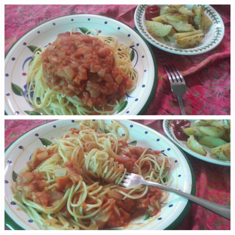 집에 토마토가 있는데 처치곤란이라 토마토소스로 변신시켜 스파게티해먹었던거.