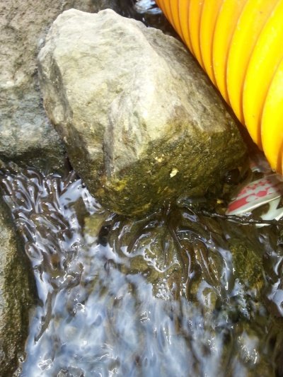 사진 3. 불법으로상류에 호스를 설치하여 하류로 물이없어 올챙이와 물고기가 물을찿아 상류로