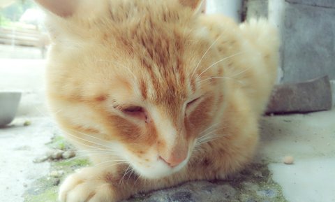 엄마가 농장에서 일하고계시는데 고양이한마리가 울고있더래요.. 부모님이 동물을 좋아 하시는지라 그리고 한쪽다리를 잃고서 절뚝 거리는 모습이 너무 안쓰러워서 두어번 먹이를 챙겨주다 지금은 인연이되어 부모님농장에 살고있어요