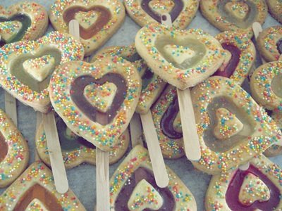 쿠키커터로 구멍내고 아이스크림 막대에 올려 반정도 굽다가 빈틈에 사탕넣고 구운것.