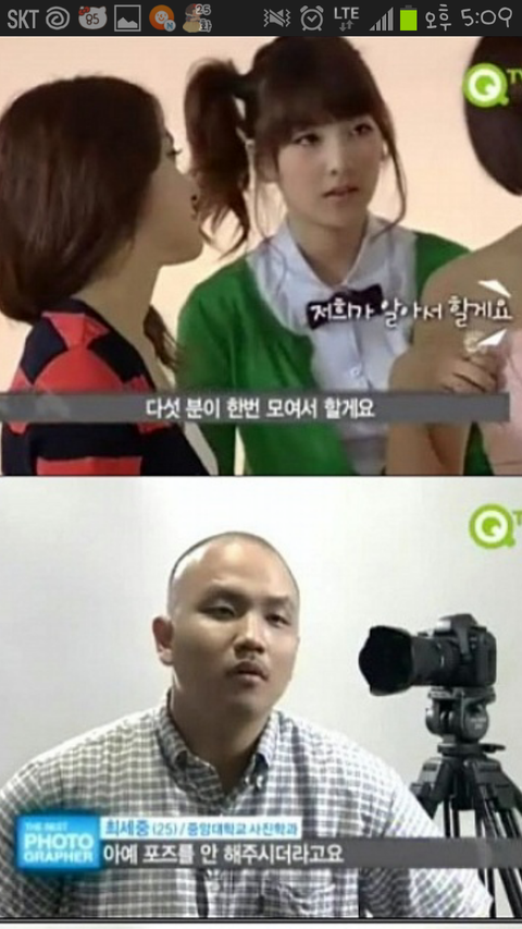 아마추어사진작가들중에 누가 제일 잘하는지 뽑는프로그램(?) 여튼 그런데 아마추어니까 리드가 부족할수도있고 여튼 카라 시키는대로 열심히했다. 제작진이 어떘냐고 묻는거에 대해서 생각해서 느낌이 이랬다 저랬다고 말해주고 그리고 저 최세중작가랑 했던건 내가 자료가없어서 못 캡쳐했는데 저 작가가 엉덩이춤추라고 시켰다함 짧은치마입어서 속이 다 비치는데 그 순간에 그걸 찍으려고하니 애들이 화나서 호응안했다함. ㅋㅋ솔직히 어떤 여자가 저기서 짧은치마입고 엉덩이춤 추면 속이 다 비치는데 그걸 하고싶겠나 저 사진작가가 변태같은거지ㅡㅡ 싸가지?여자가 자기 몸 지키려고 하는데 그게 왜 싸가지없는거? 조카 어이없넼ㅋㅋ시발 편집 묘하게 해놔서 괜히 의심하게 만들지마라^^ㅗ 너소퀴냐?ㅡㅡ