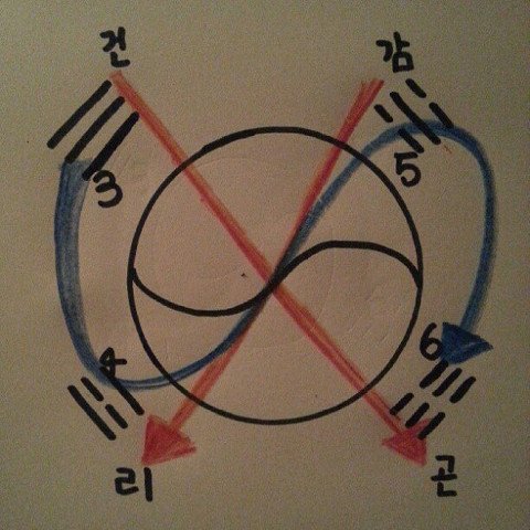 음..괘 그리기..조금 헷갈리죠? 어디가 건이고..어디가 곤이고..어디가 다섯줄이고ㅜㅜ어디가 세줄이고..ㅜㅜ 자!!사진의 파란색 선이 지나가는 대로..음..그러니까 태극 문양속 물결 모양이 지나가는 방향대로 괘를 그려주시면 돼요! 3개,4개,5개,6개 이런 식으로..