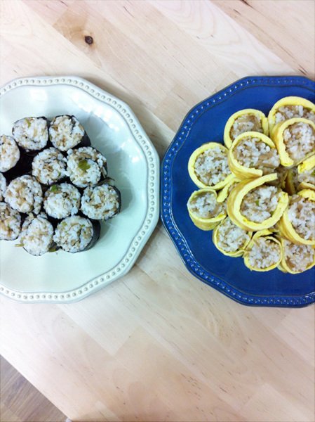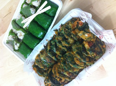 아욱 깻잎 주먹밥이랑 오징어부추전.