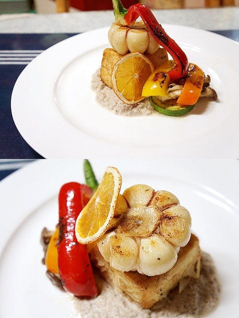 버섯 퓌레를 곁들인 두부와 구운 야채