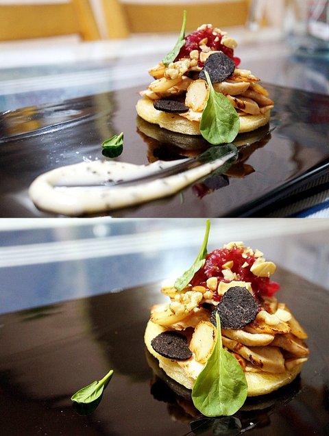 송로버섯과 석류 식초에 볶은 적양파, 그리고 아카시아 꿀을 섞은 송로버섯 마요네즈를