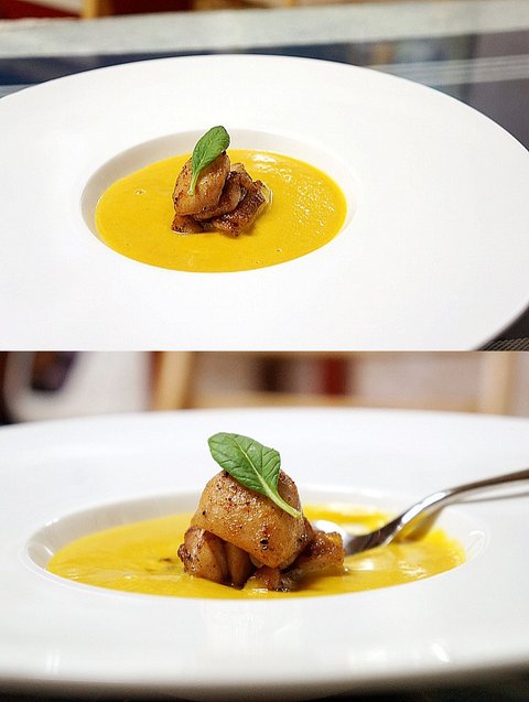 시나몬을 발라 구운 닭다리살과 단호박 스프
