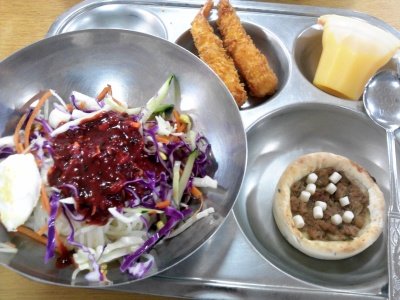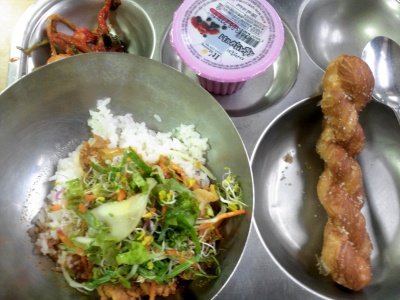 생야채불고기비빔밥/찹쌀꽈배기/블루베리쥬스/총각김치