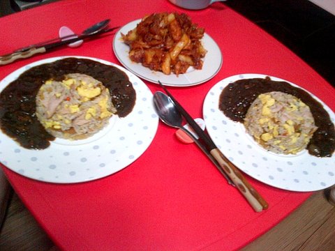 닭강정역시 고추장양념으로 준비했구요~ 볶음밥에 짜장은 친정아버지가 보내주셨습니다