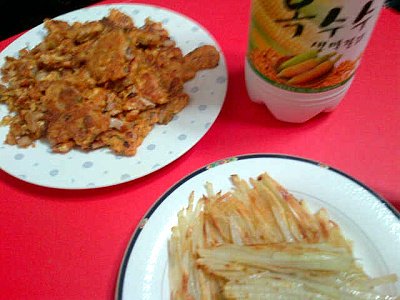 김치고기전과 감자전이에요.